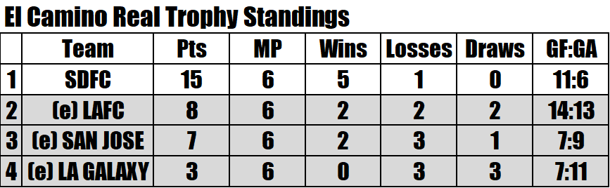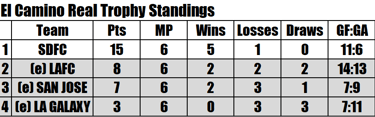 Standings for the El Camino Real, California Supporters Trophy are shown below.